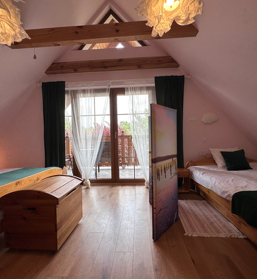 Apartament kaszubski to 88 m2 przestrzeni do Państwa dyspozycji , usytuowanej na pierwszym piętrze budynku z niezależnym wejściem. Apartament składa się z ogromnej sypialni z pięknym tarasem od strony wschodniej oraz przestronnego salonu z aneksem kuchennym z dużym tarasem od strony zachodniej oraz dużej łazienki z wanną.
